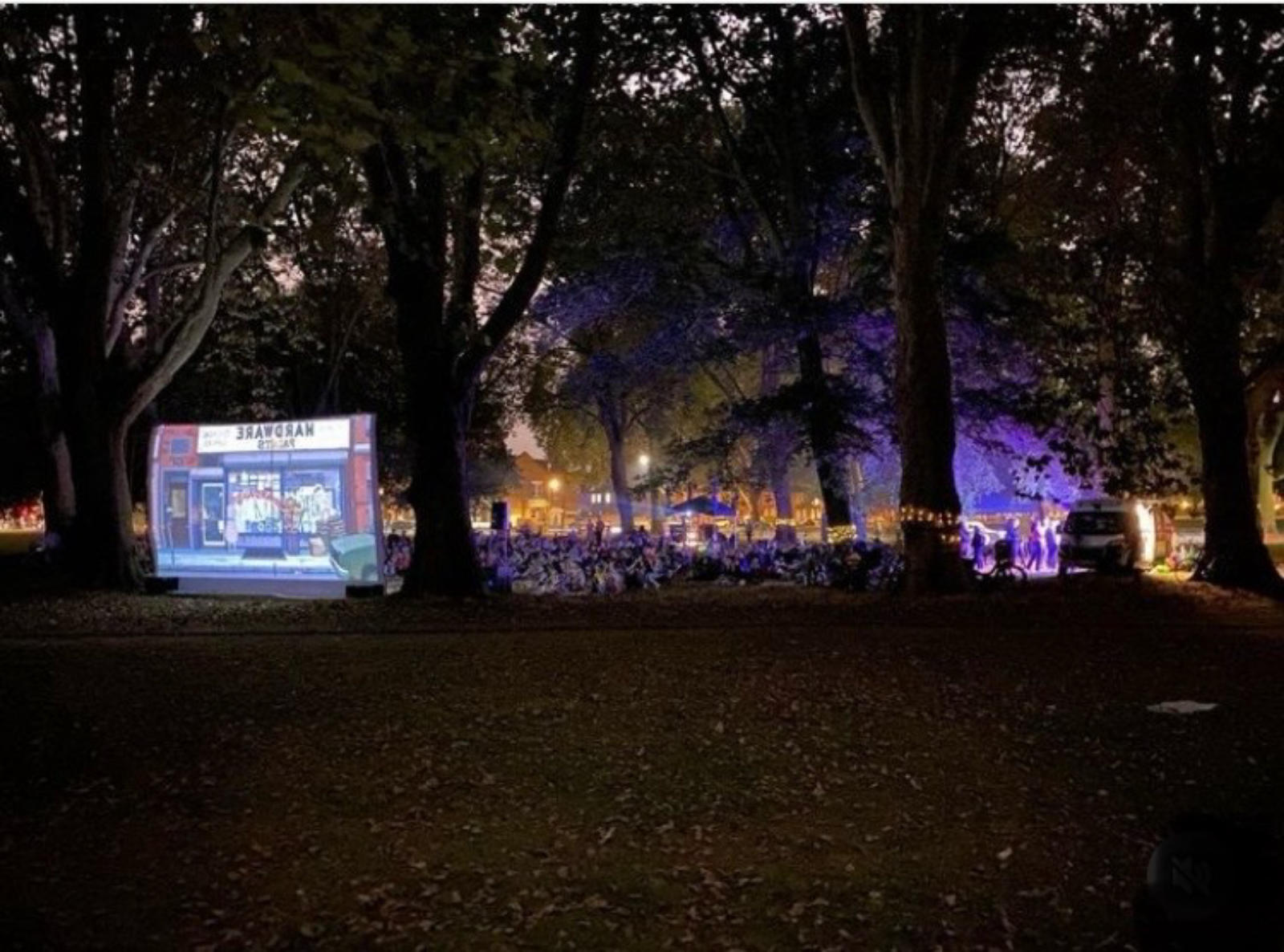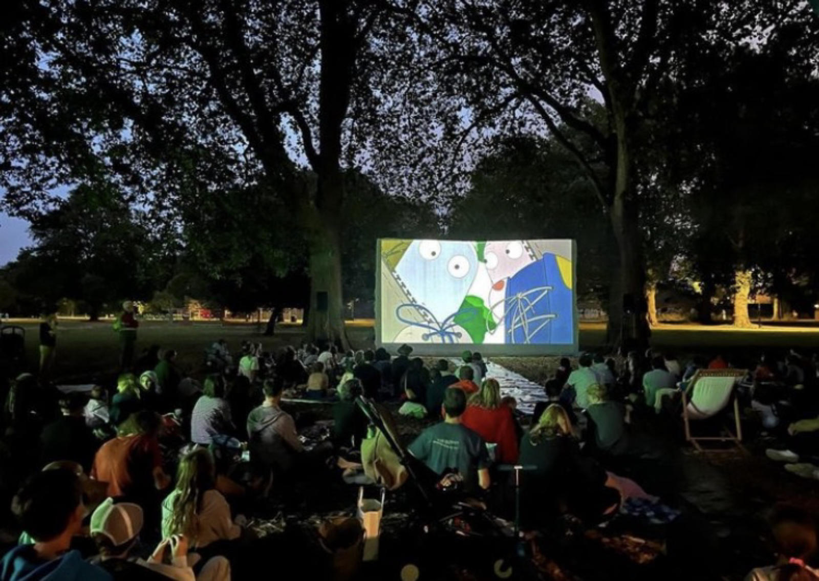 Blankets and thermoses come out and everyone settles in. It is always a magical event, and somehow it never manages to rain. We have supported Tree Circle Cinema since its inception through minimal pricing and lots of free set up and installation advice. Over the years they have grown and worked out good strategies to make the event work well. We use our bespoke outdoor screen which is rigged with a selection of catenary from tree to tree. Our projector and long throw lens is housed in a gazeebo and power is routed from a Green Voltage generator which is a silent battery generator that is perfect for an outdoor cinema. The programming has developed and there is always a good crowd who come along and participate.